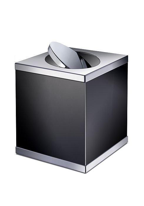 Square bath bin with a swivel lid, made of solid brass in a satin black finish with a full chrome lid and base.