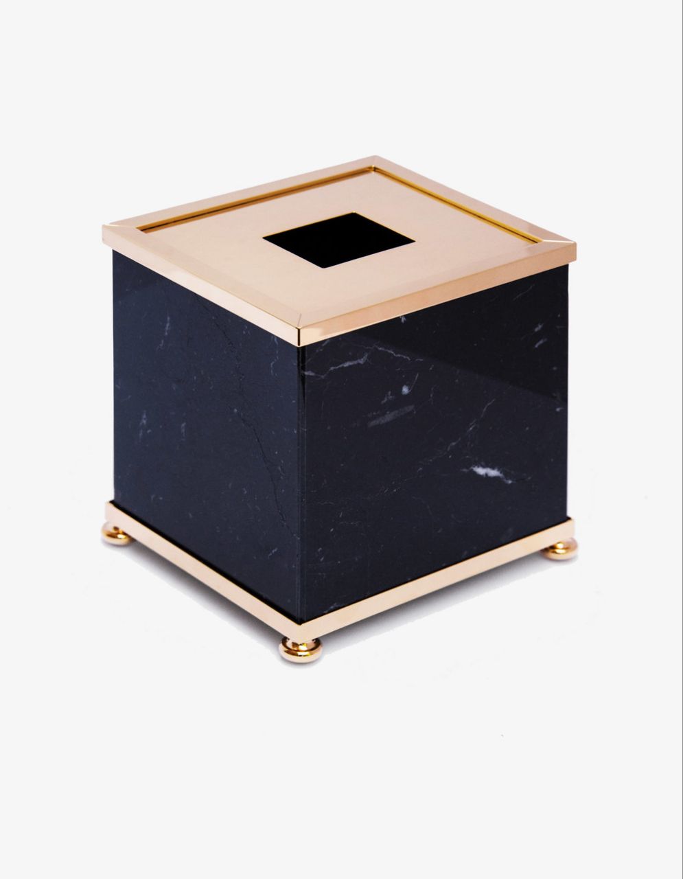 Add a pop of interest and elegance to your bathroom sink and create a contrast that will make its surroundings stand out like never before with this deliciously dark tissue box, hand-cut in majestic marble and nested between beautiful metal accents available in 24-karat gold-plating and other bespoke finishes.