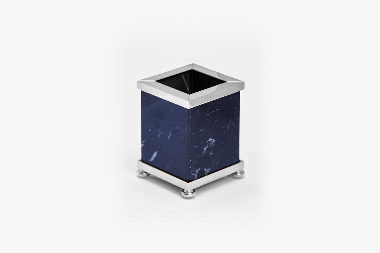 The gentle yet incremental effect of these magnificent jars, lined with fine 24-karat gold-plated or chrome metallic detailing available in other custom finishes upon special order, lets you build up a luxurious white or black marble display without overwhelming the eye.