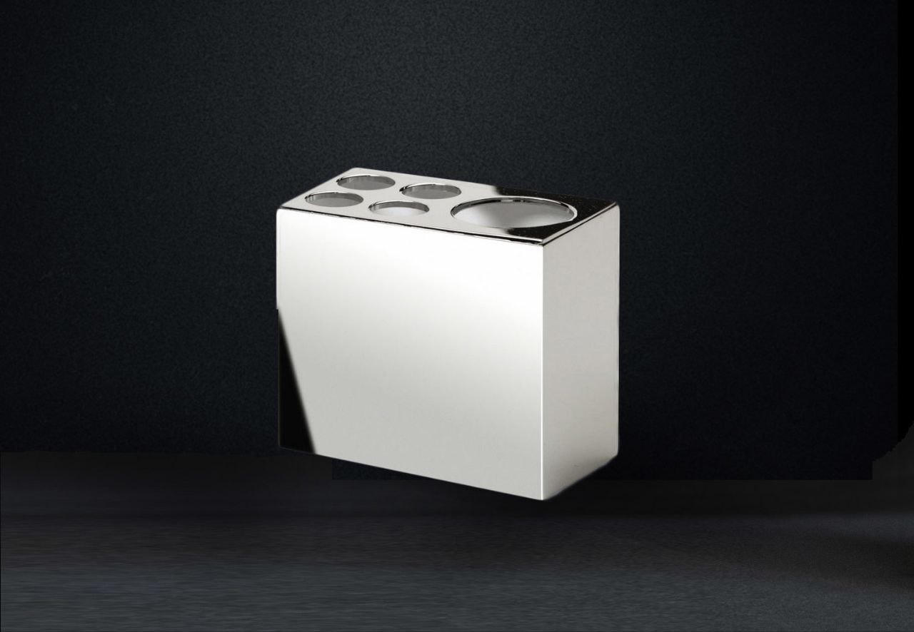 Brush holder made of solid brass is available in a polished chrome or satin nickel finish, the lid has four smaller compartments and one larger to keep brushes separate.