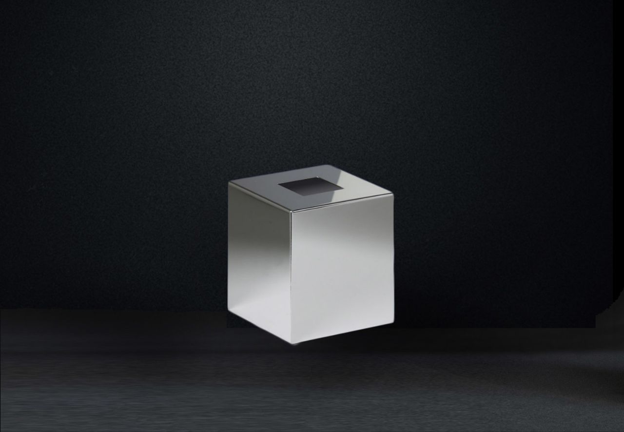 Square boutique tissue box made of solid brass in a box design elegantly finished in chrome with a square opening on the top face. Other finishes include satin nickel (87137-SNI) or 24-karat gold-plated (87137-O).