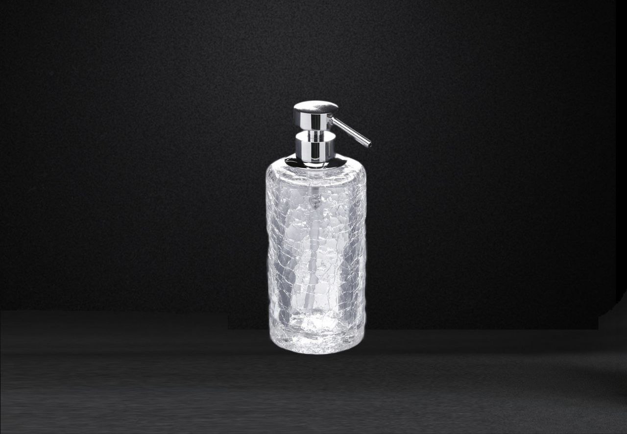 Cracked crystal soap dispenser with an elegant solid brass pump finished in chrome, 24-karat gold-plated, satin nickel or rustic brushed brass