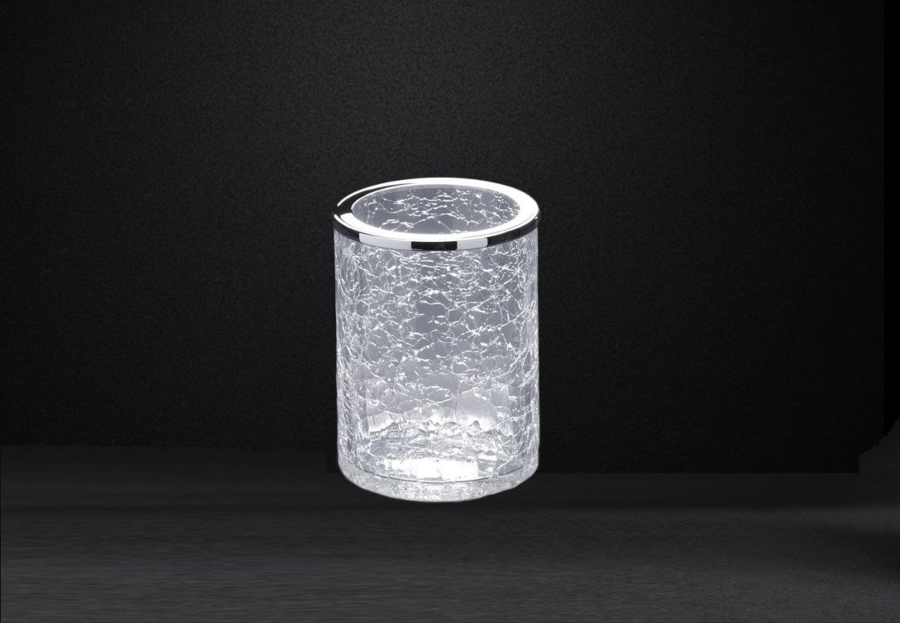 Brush holder made of cracked crystal, presented with a solid brass rim and beautifully finished in chrome, 24-karat gold-plated, satin nickel or rustic brushed brass.