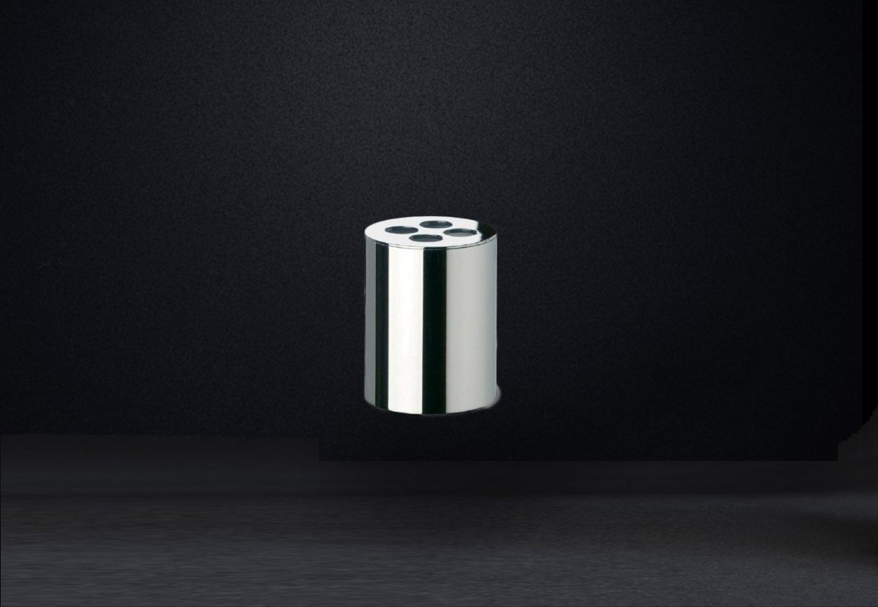Brush holder made of solid brass finished with a stylish and smooth chrome exterior, has four compartments in the lid to keep brushes separate. Available finishes: chrome, satin nickel, 24 karat gold plate or rustic brushed brass.