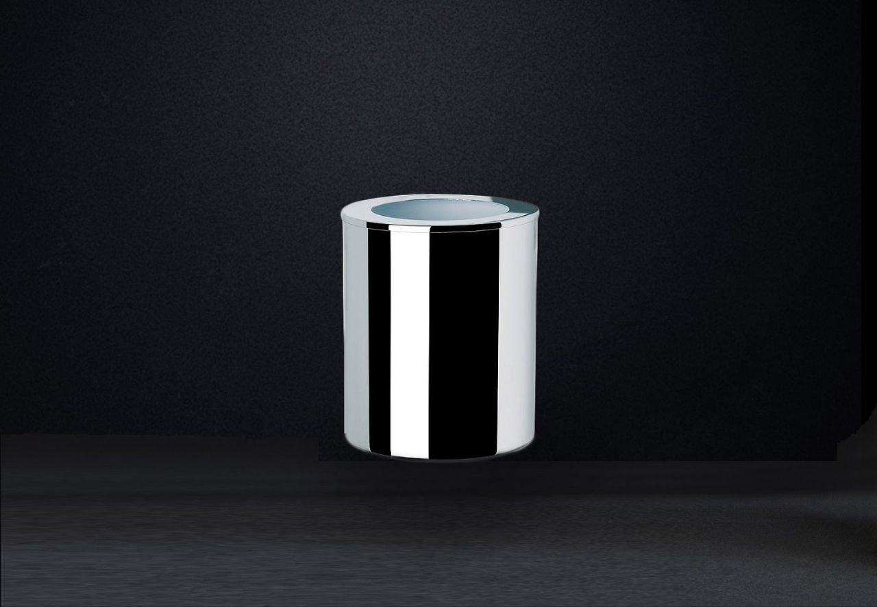 Solid brass bath bin, with a stylish thick circular rim around the top is available finished in chrome, 24 karat gold plate, rustic brushed brass, chrome and 24 karat gold or a combination of satin and nickel.
