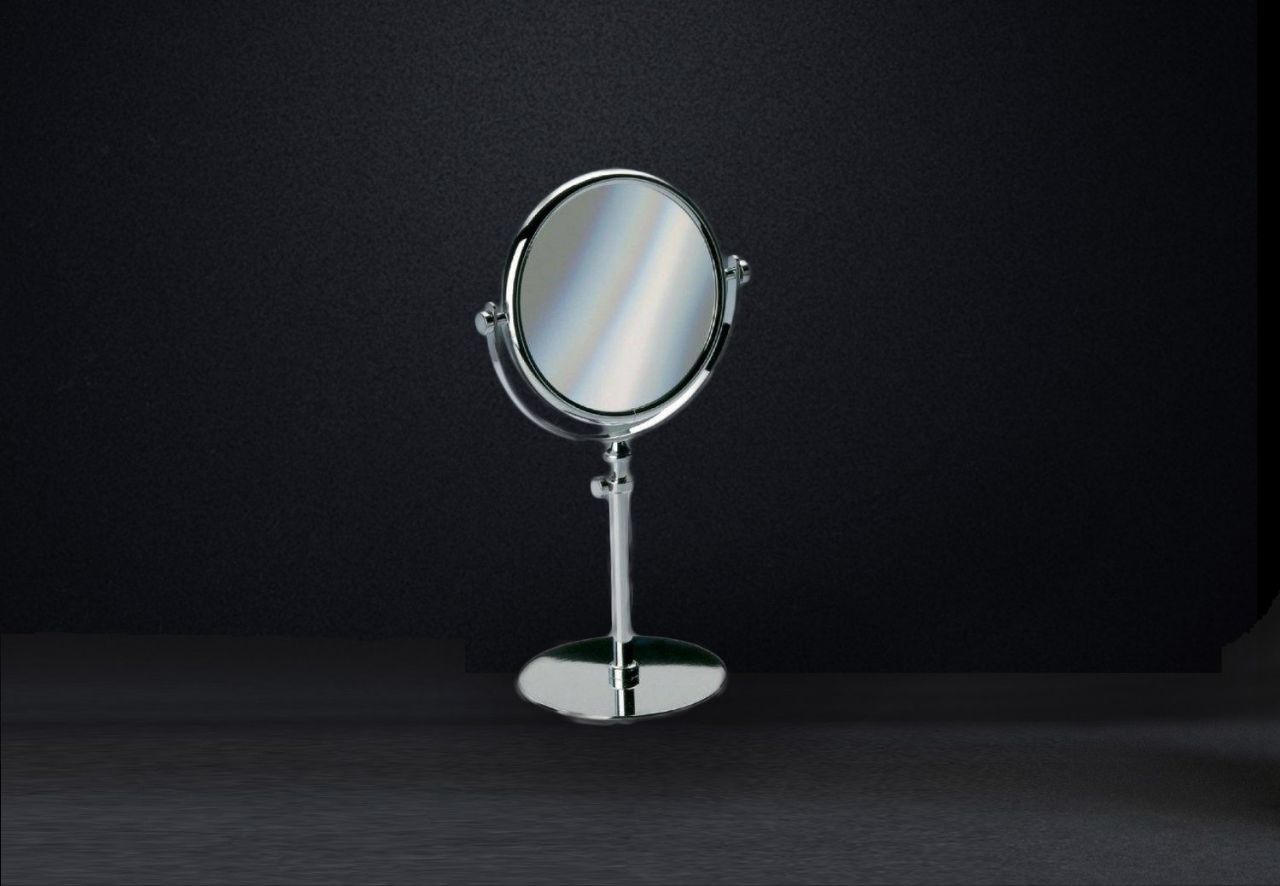 Table mirror made of solid brass has a round base and an extendable height. Available finished in chrome, rustic brushed brass, satin nickel or 24 karat gold plate.