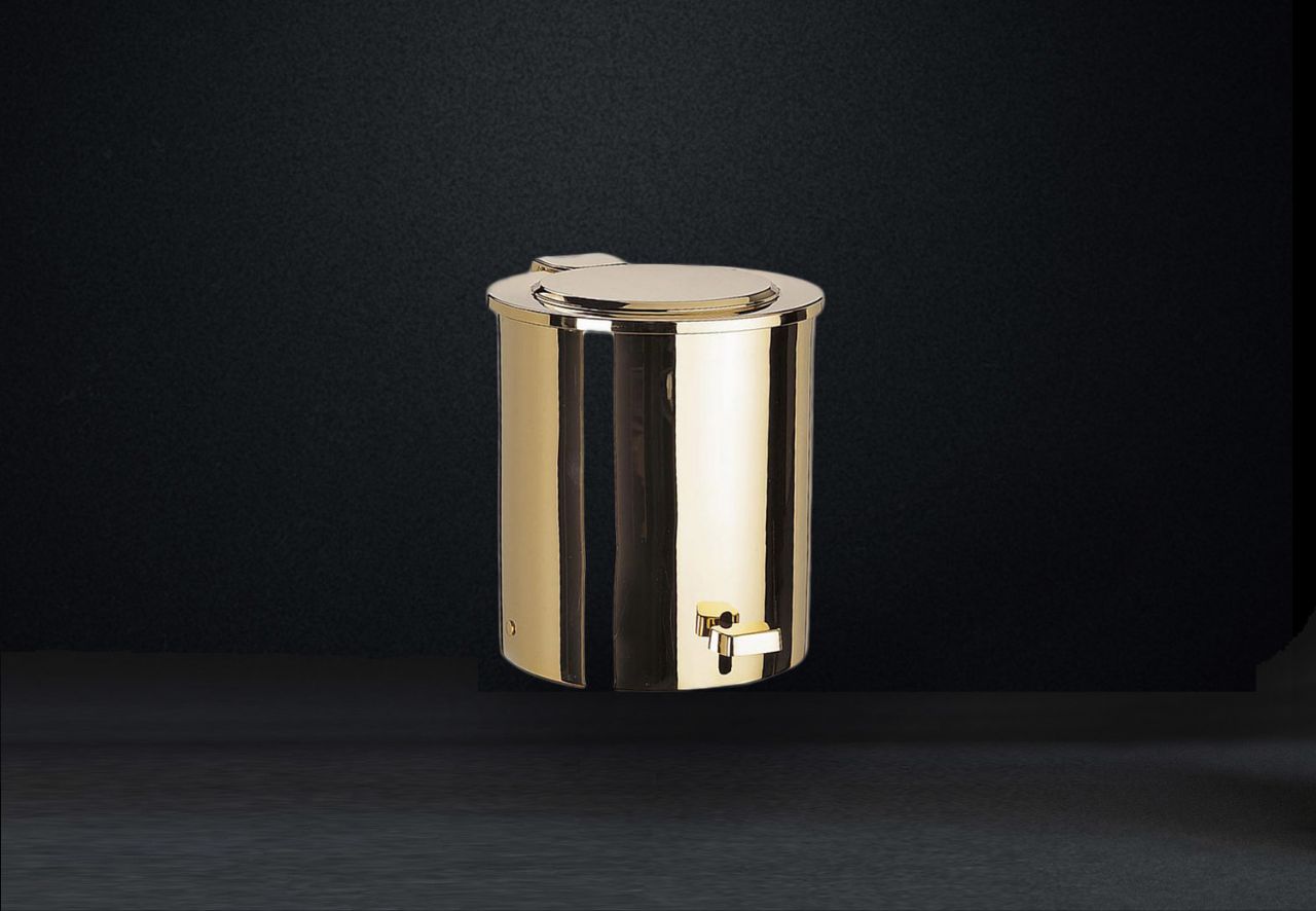 Solid brass pedal bath bin with cover is available with a traditional chrome plating, a combination of chrome and 24k gold, rustic brushed brass, 24k gold or a satin and nickel finish.