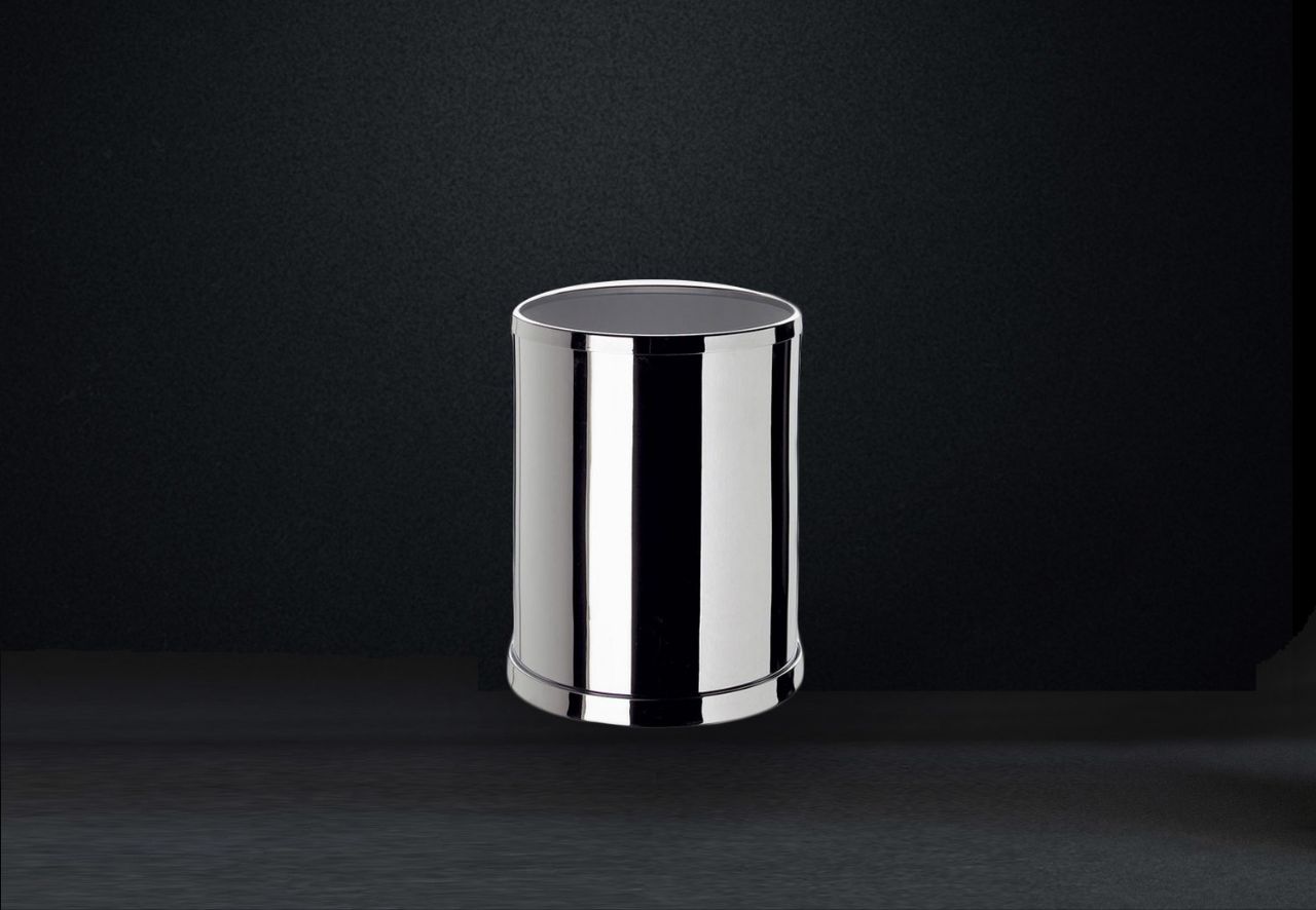 Bath bin made of solid brass, finished with a stylish chrome plating. Other finishes available include: rustic brushed brass, 24k gold, satin nickel or a combination of chrome and 24k gold.