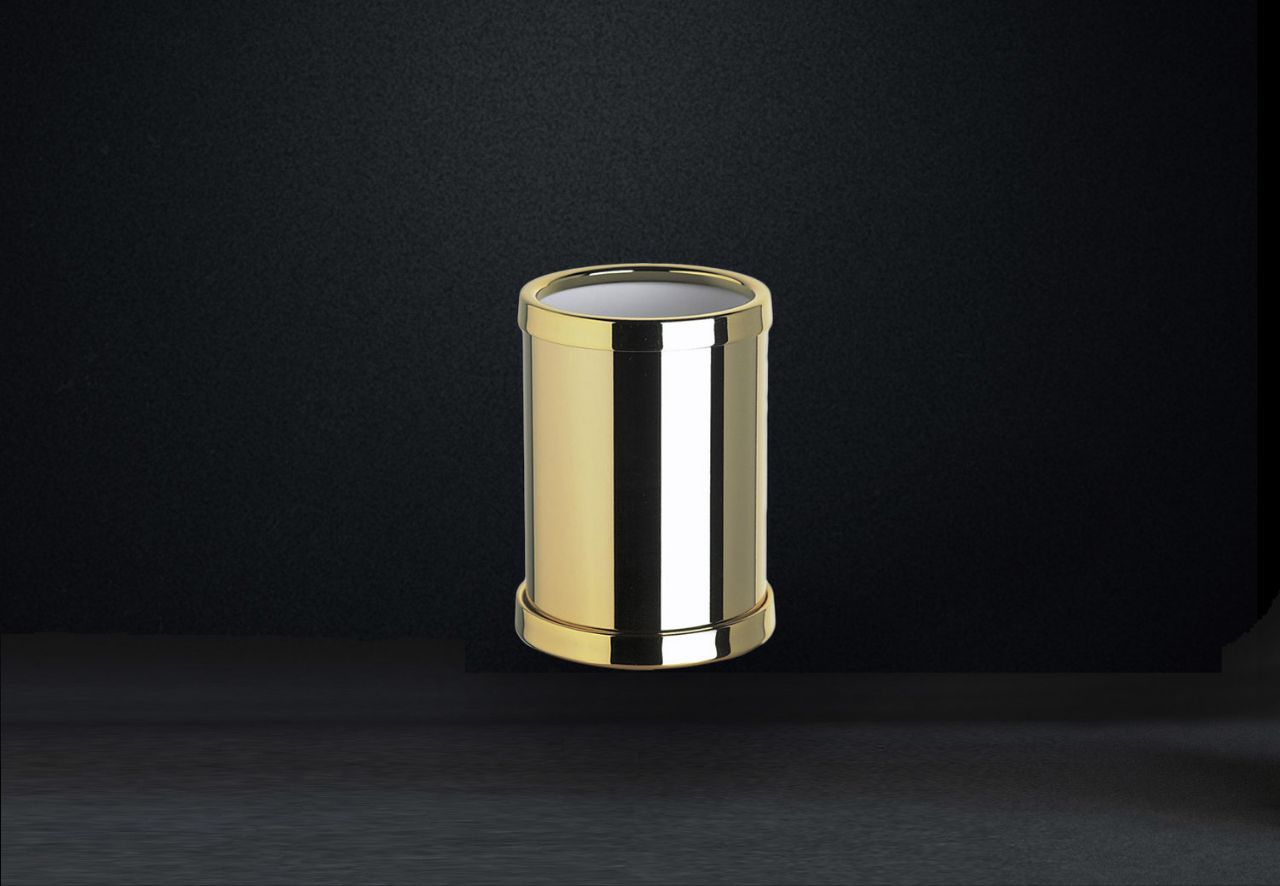 Solid brass brush holder with a ribbed detail and available finished in Chrome, 24k gold, satin nickel, satin and chrome or a combination of chrome and 24k gold plating.