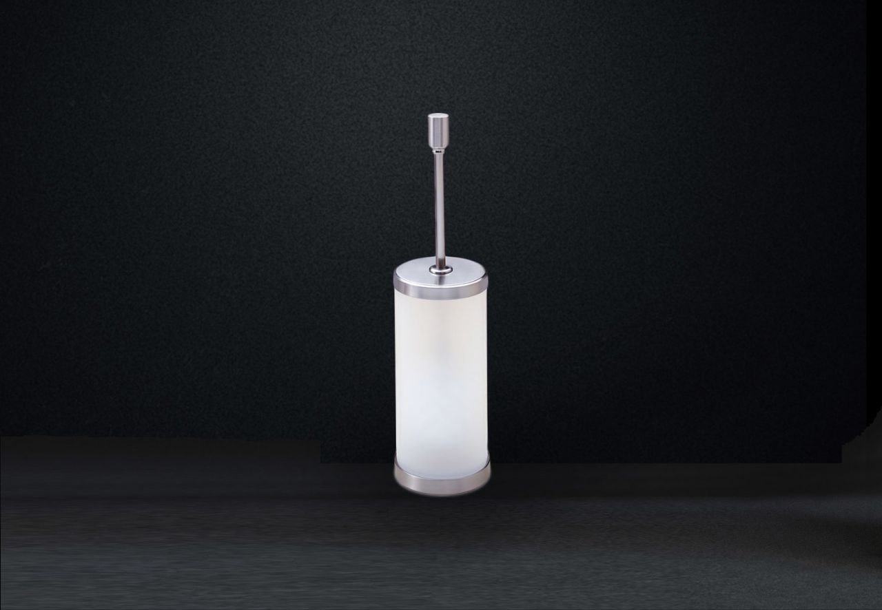 Stylish frosted crystal toilet brush holder with a solid brass base and lid, finished in satin nickel. Other finishes include chrome (89108-MCR), 24k gold plate (89108-MO) or chrome/gold combination (89108-MCRO).