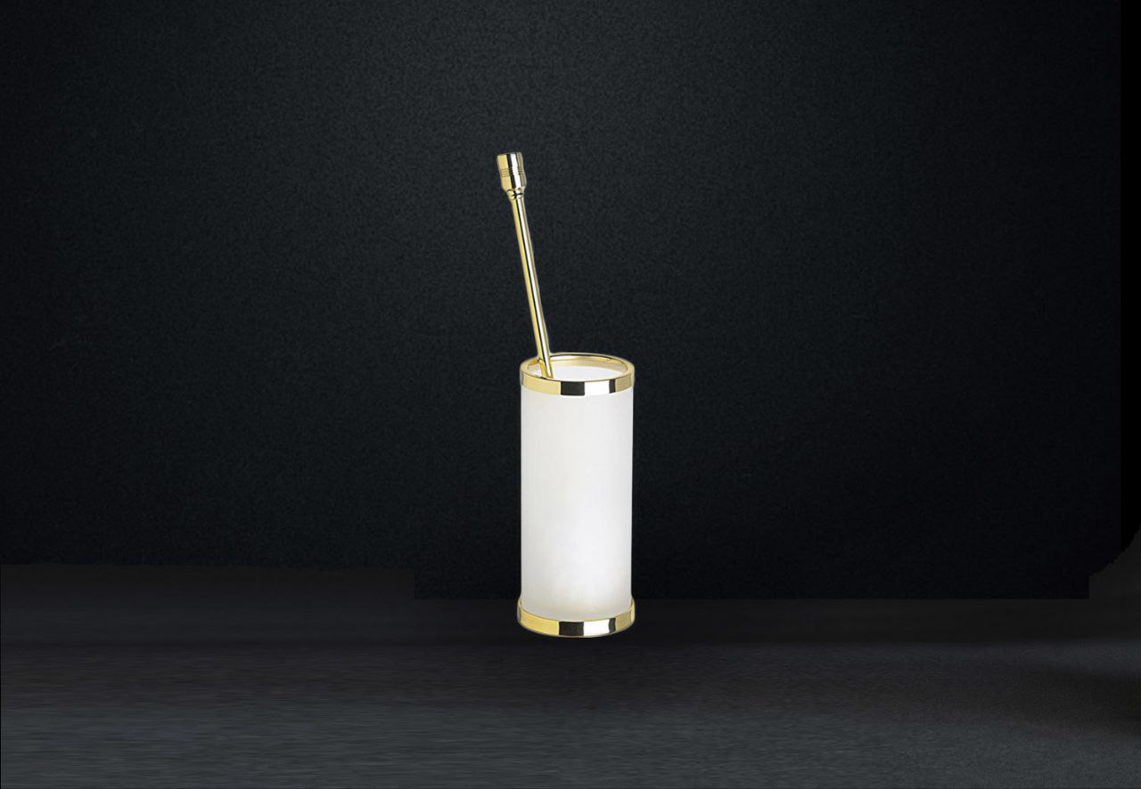 Stylish toilet brush holder with a small amount of ribbed detail on the handle, has a body made of frosted crystal and a solid brass base and rim. Available finished in chrome, 24k gold, a combination of chrome and 24k gold or satin and nickel.