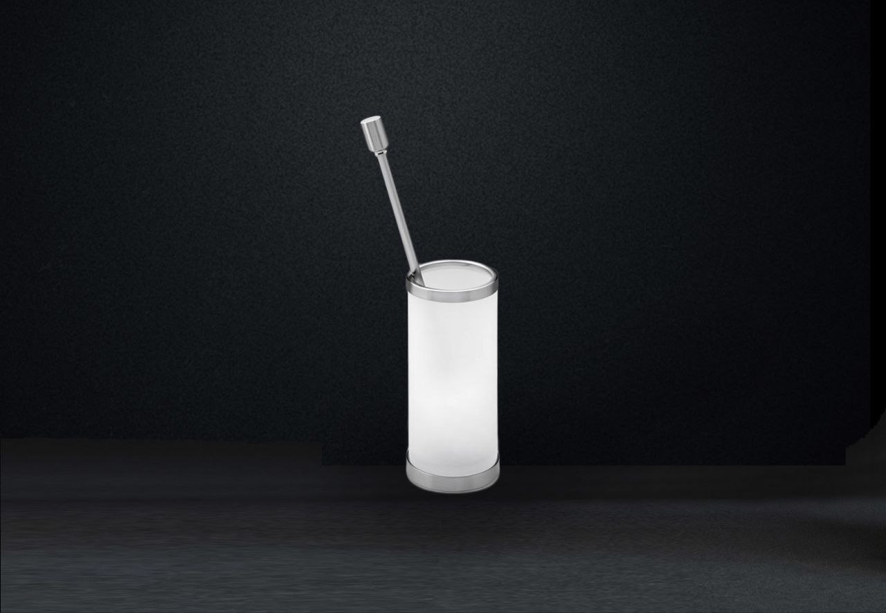 Stylish frosted crystal toilet brush holder with a solid brass base, rim and handle, finished in satin nickel. Other finishes include chrome (89109-MCR), 24k gold plate (89109-MO) or chrome/gold combination (89109-MCRO).