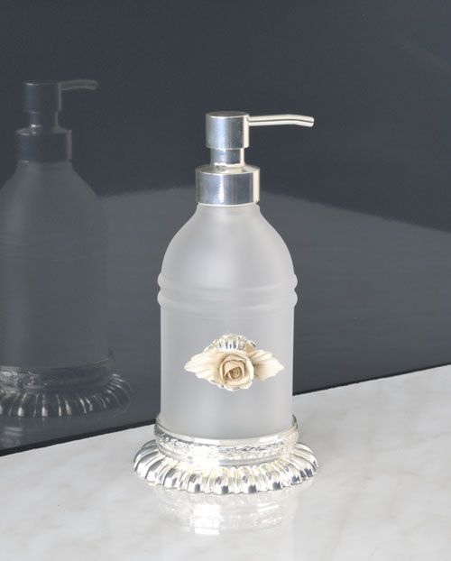 Soap dispenser made of frosted crystal with decorative base and a beautiful porcelain rose on the front. Pump and fittings made of solid brass and available in silver.