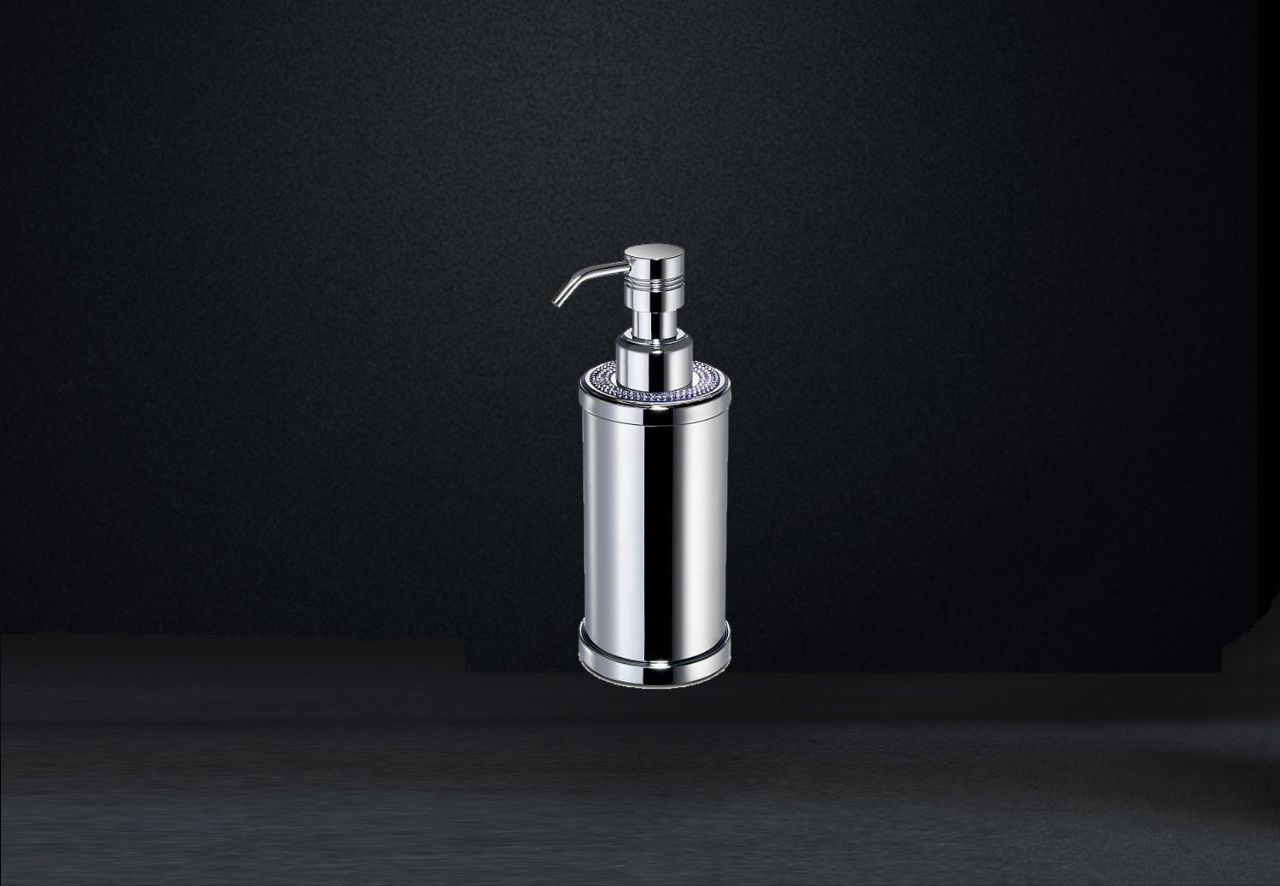 Round soap dispenser made of solid brass and embedded with Swarovski crystals by hand. Pump and fittings are available in a chrome (90538-CR) or 24-karat gold-plated finish (90538-O).