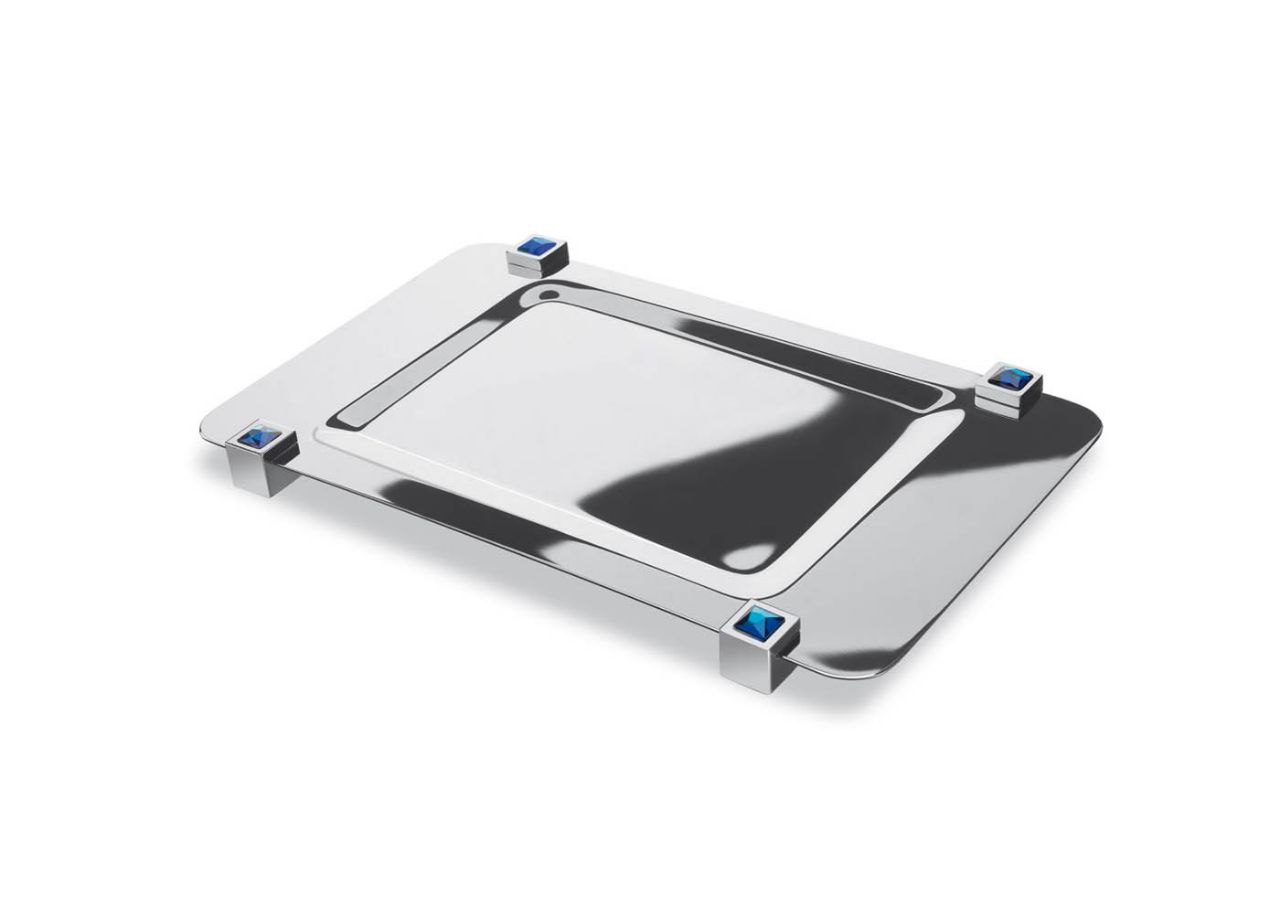 Beautiful solid brass tray elegantly decorated with a dazzling blue Swarovski crystal in each of the four corners. This tray is available in polished chrome finish (51517-CRA) or 24-karat gold plated (51517-OA).