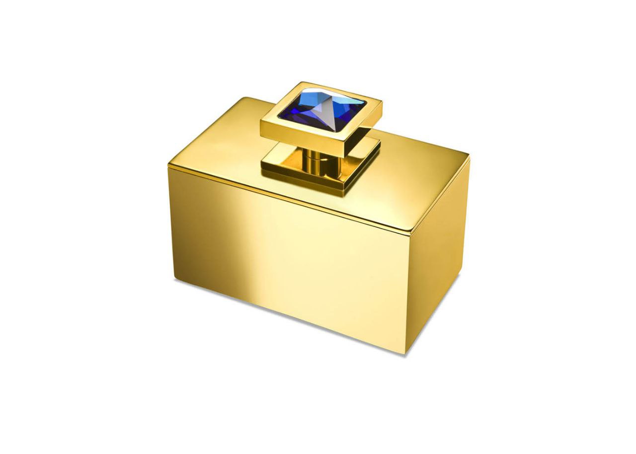 Stunning rectangular cotton buds jar made from solid brass with a smooth 24-karat gold plated finish and a dazzling large blue Swarovski crystal on top of the square handle.