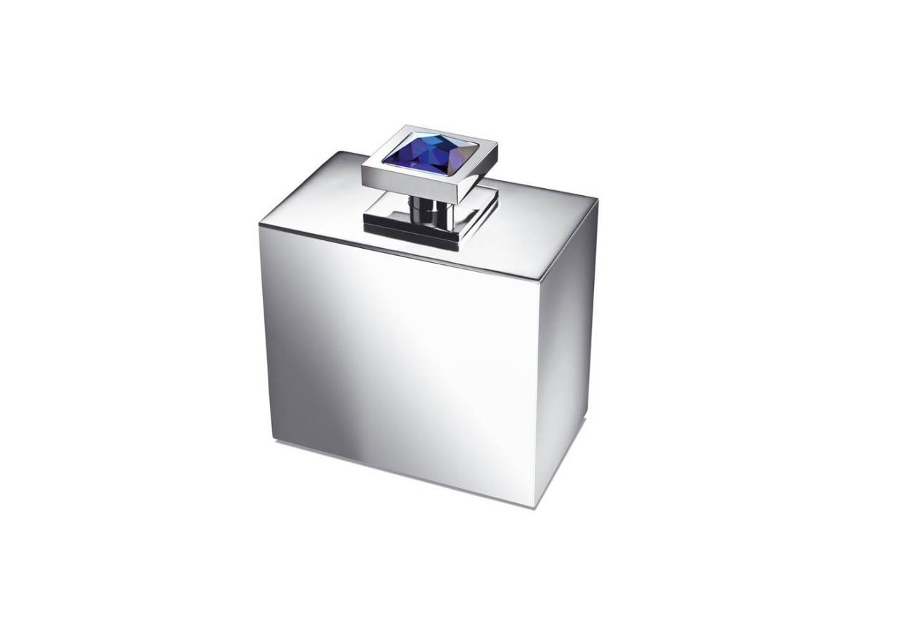 Stunning rectangular cotton wool jar made from solid brass with a smooth polished chrome finish and a dazzling blue Swarovski crystal on top of the square handle.