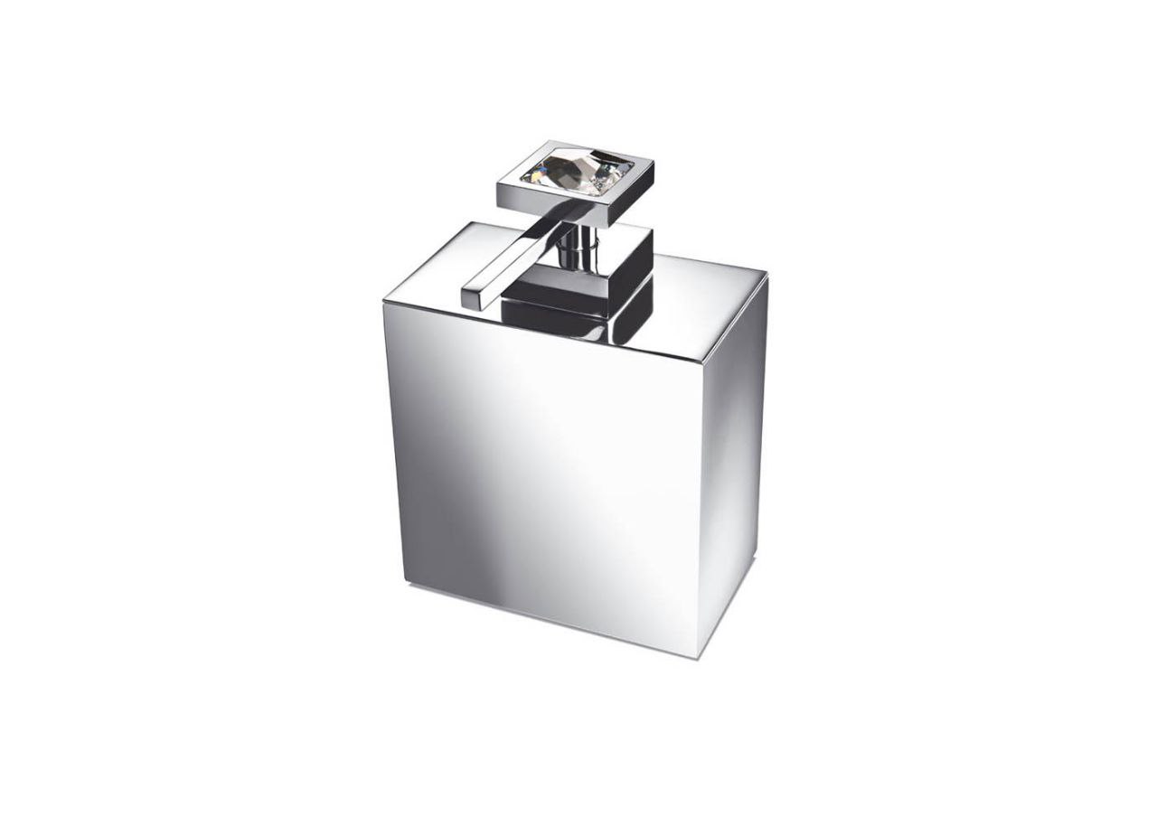 Striking rectangular liquid soap dispenser made of solid brass with a smooth polished chrome finish and decorated with a dazzling white Swarovski crystal on top of the pump.