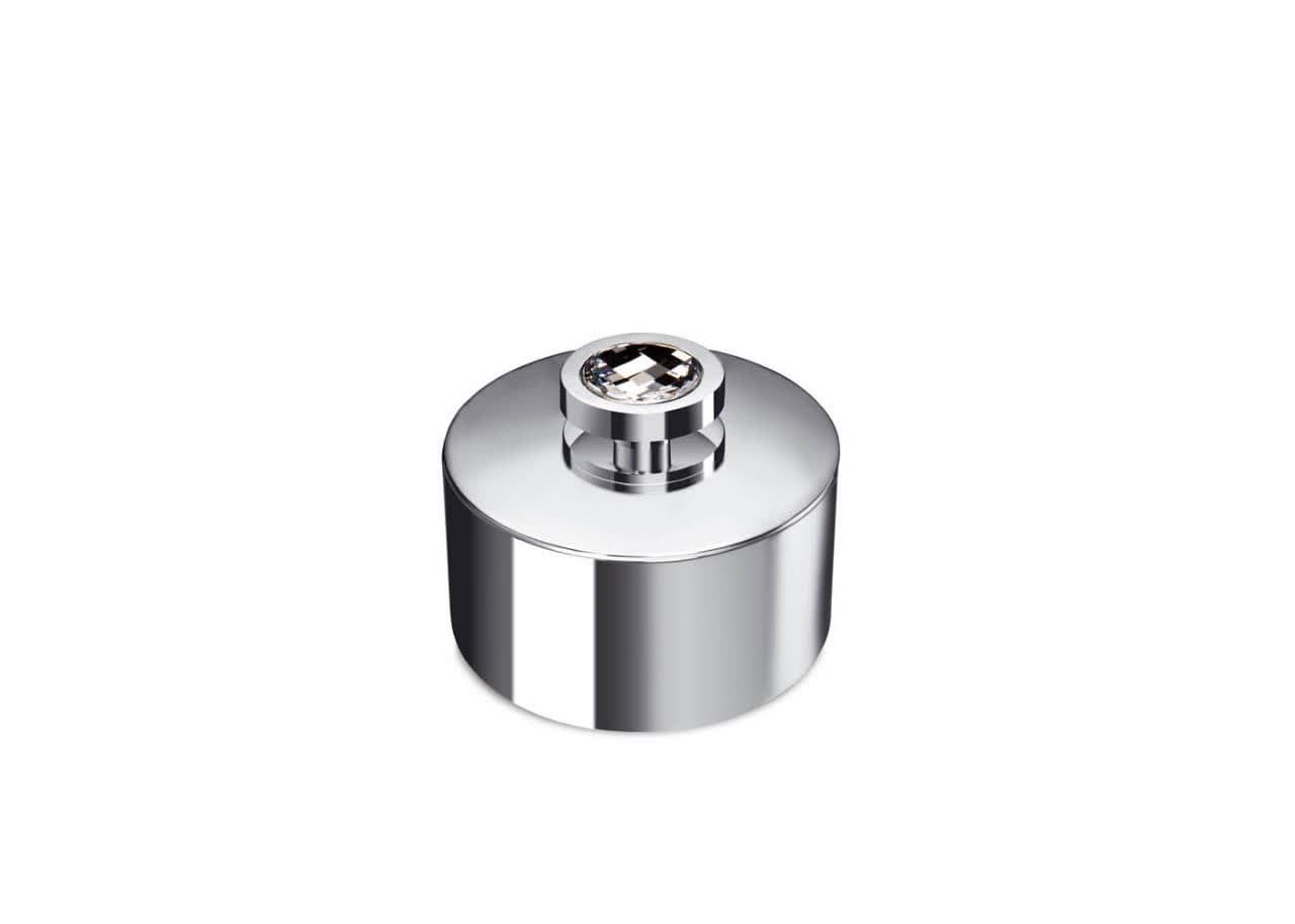 Stunning round cotton bud jar made from solid brass with a smooth polished chrome finish and a dazzling white Swarovski crystal on top of the circular handle.