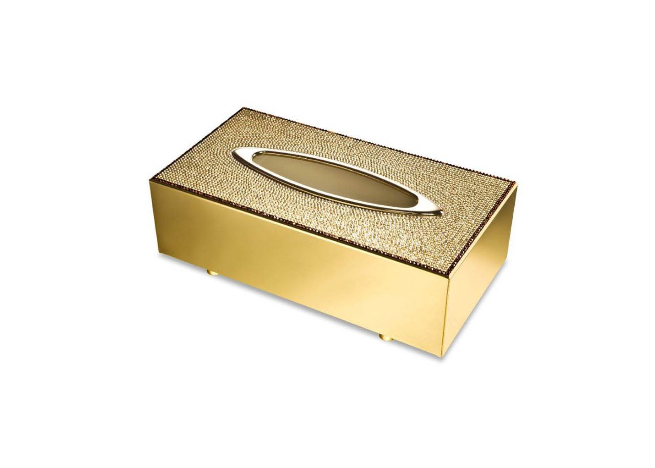 Luxury tissue box cover elegantly designed by Swarovski jewelers. With a ribbed opening and made of solid brass with 24-karat gold plating, the dazzling top face is entirely covered with individually placed Swarovski crystals.