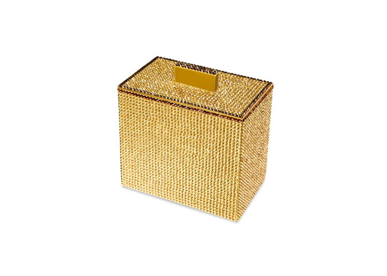Cotton wool jar made of solid brass has been coated with Swarovski crystals, hand placed by Swarovski’s own designers and is available in a chrome or 24 karat gold finish.