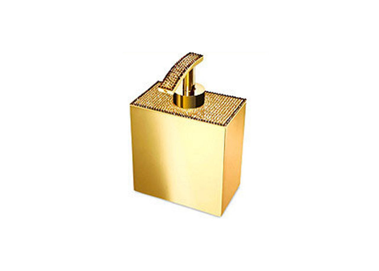 Soap dispenser made of solid brass in a chrome or 24 karat gold finish, has been elegantly decorated by Swarovski designers who have hand placed Swarovski crystals over the top of the pump and around the base for a stylish finish.