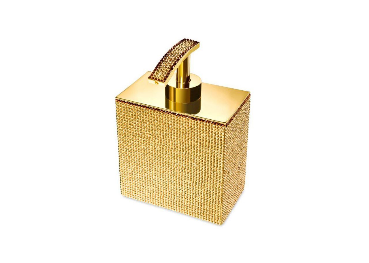 Soap dispenser made of solid brass in a chrome or 24 karat gold finish, has been elegantly decorated by Swarovski designers who have hand placed Swarovski crystals over the top of the pump and around the base for a stylish finish.