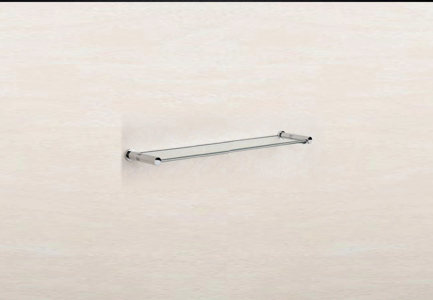 Glass shelf elegantly placed on two solid brass brackets, each with a ribbed detail and available finished in chrome (85345-CR) 24k gold plate (85345-O), satin nickel (85345-SNI) or a combination of chrome and 24k gold plate finish (85345-CRO)