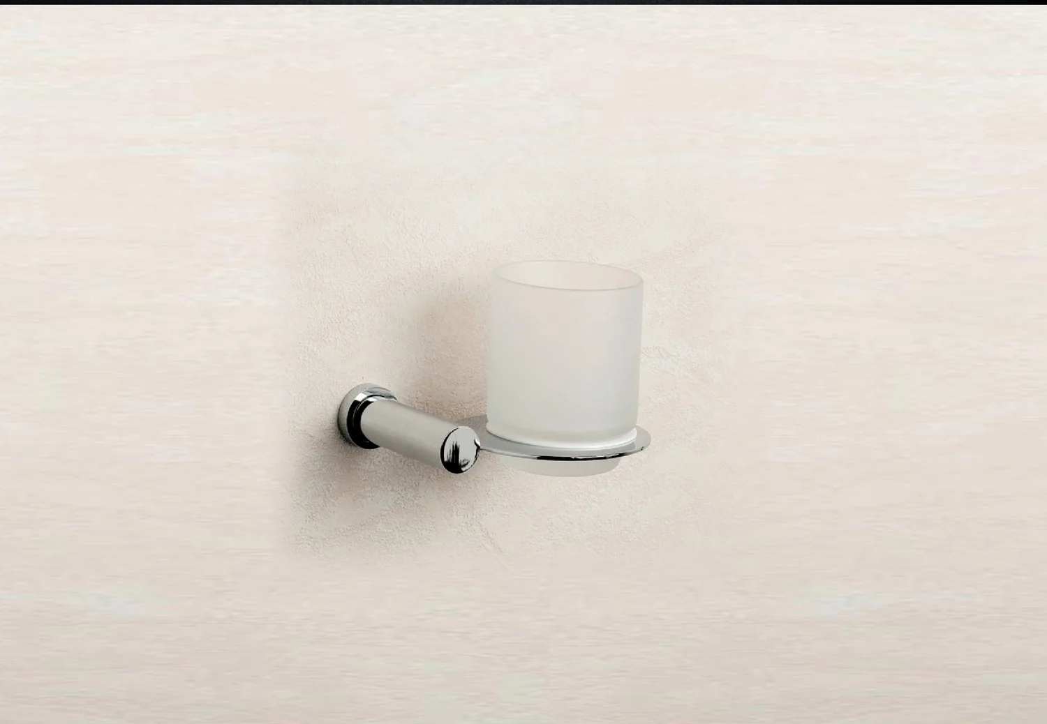 Frosted crystal tumbler elegantly placed on a solid brass bracket which a has ribbed detail near the base and is finished in chrome (85356-MCR), 24k gold plate (85356-MO), satin nickel (85356-MSNI) or a combination of chrome and 24 karat gold plate (85356-MCRO).