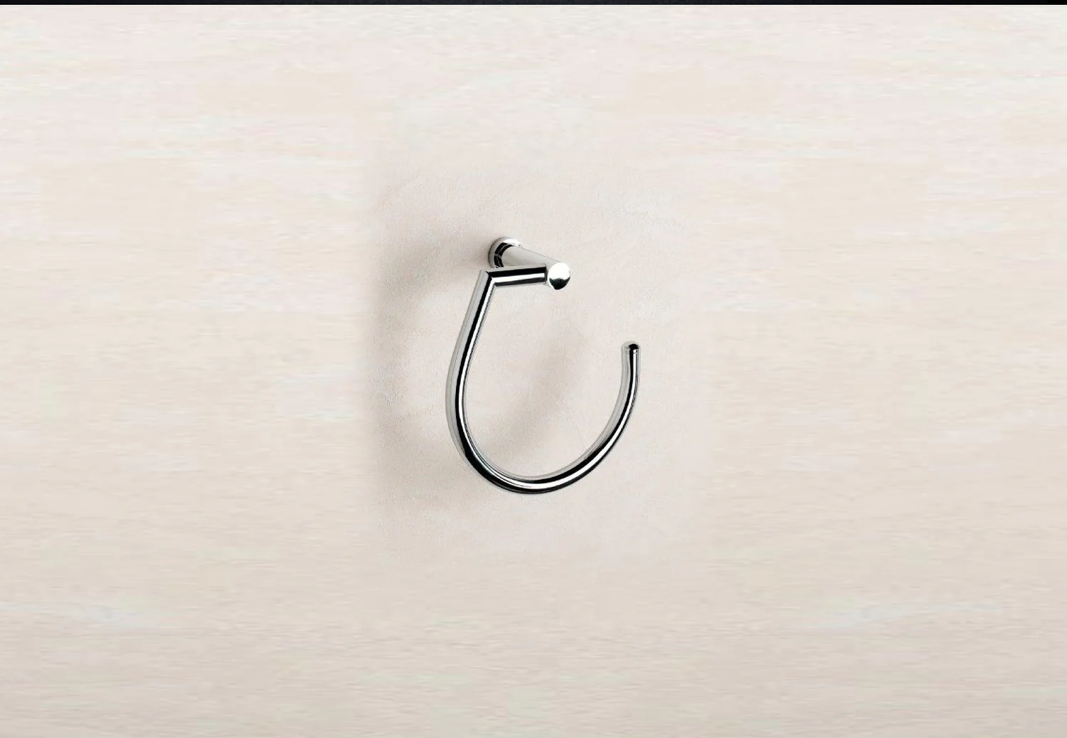 Solid brass towel ring, available for purchase finished in chrome, 24 karat gold plate (85440-O), satin nickel (85440-SNI) or a chrome and 24k gold plate combination (85440-CRO).