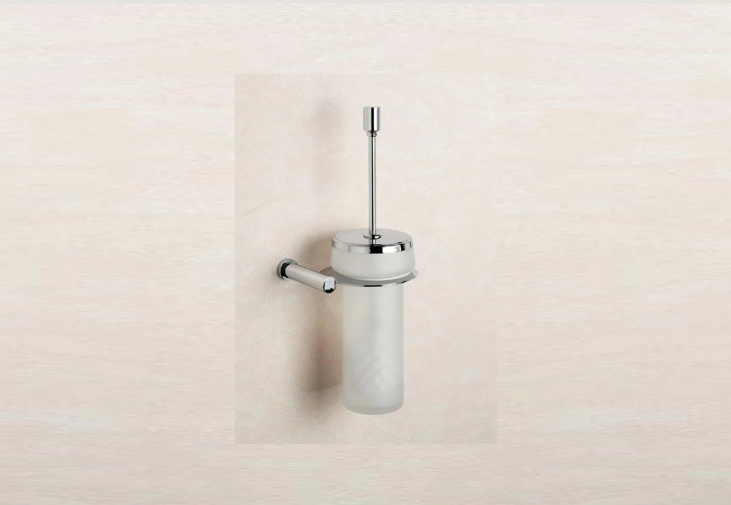 Wall mountable frosted crystal toilet brush holder with a solid brass handle, lid and bracket, available finished in chrome, 24k gold plate (89430-MO), satin nickel (89430-MSNI) or a combination of chrome and 24 karat gold plate (89430-MCRO).